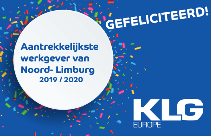 KLG Europe is vandaag uitgeroepen als de Aantrekkelijkste Werkgever van Noord Limburg. Samen met de winnaars van Zuid,- en Midden Limburg is KLG nu nog in de strijd om de titel Aantrekkelijkste Werkgever van Limburg 2019/2020 te worden.